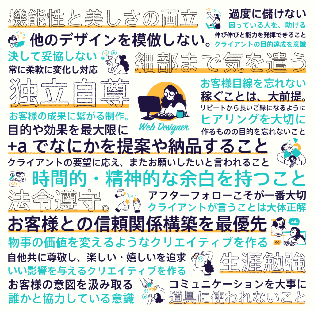 前回、Webデザイナーの皆さんから『仕事の信念』について回答いただき、以下のような素敵なコメントをたくさんいただきました。これらの素敵な信念たちの背景には、上記のような様々な苦労やドラマがあったのだろう…と想像が容易いですね。