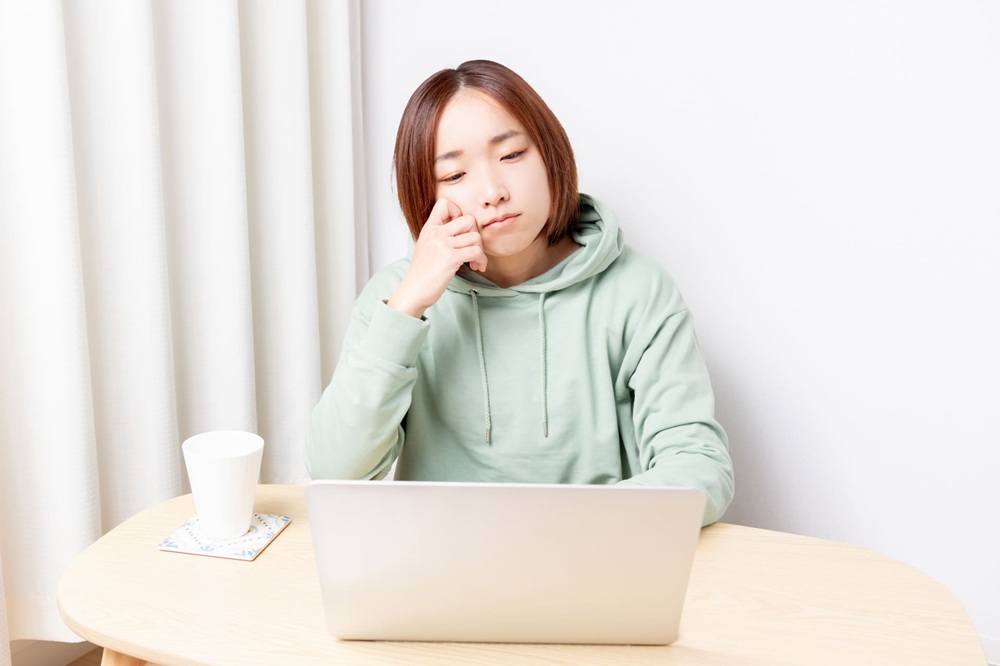 ノートPCを眺めながら頬杖をつくパーカーを着たショートカットの女性