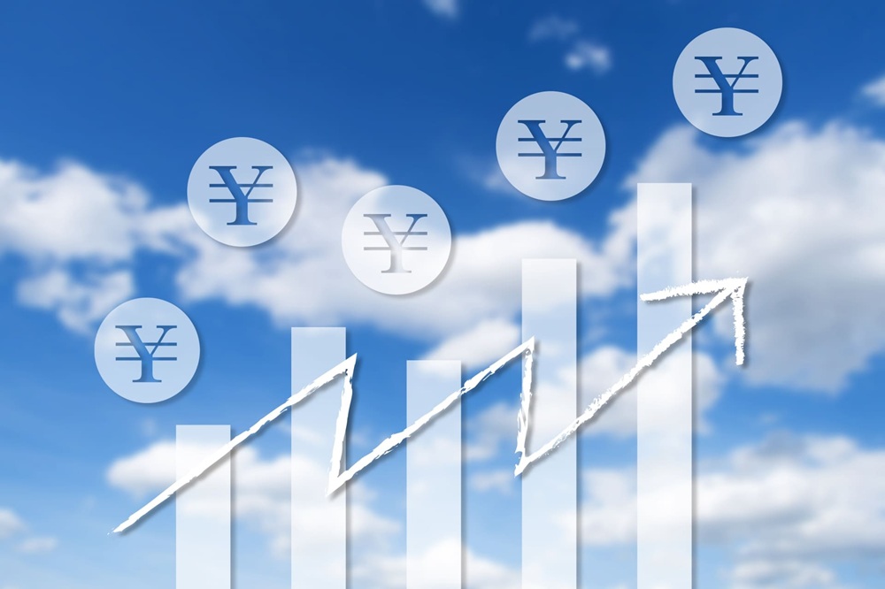 青空の背景に半透明の5本の棒グラフと5つの「¥」マーク