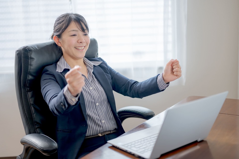 ノートPCを前に両手でガッツポーズをするビジネスウーマン