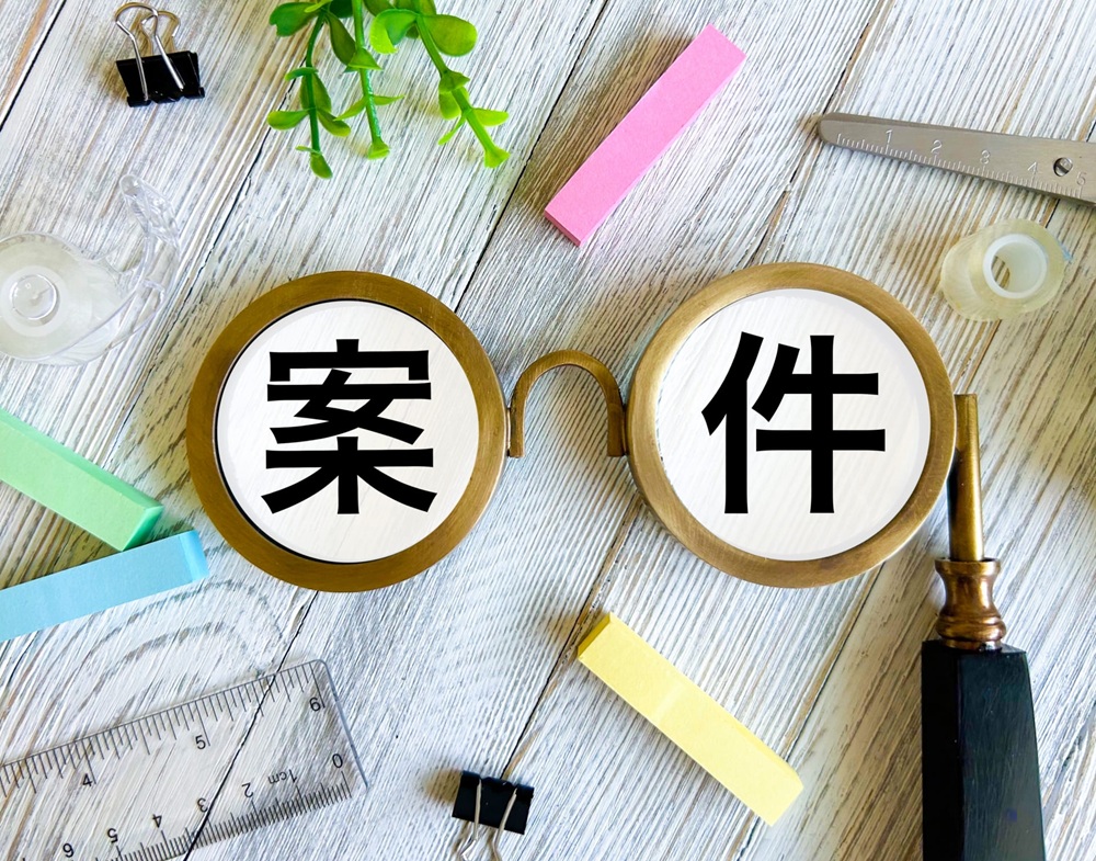 「案件」という文字が書かれたおもちゃの眼鏡とそれを囲むように置かれた複数の文具